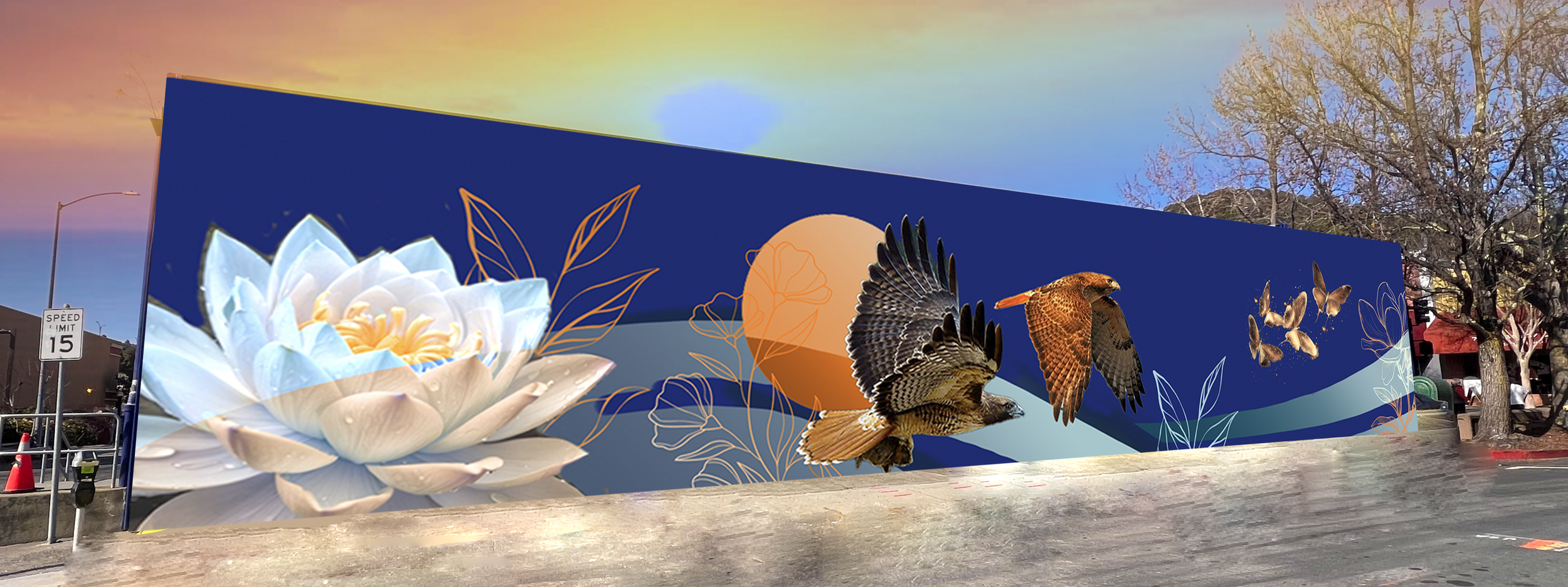 We have a vision of painting a nature-inspired wall of birds, a lotus and other flowers, local plants and butterflies leading you all the way up to Fourth Street. The lotus flower is a symbol of transformation and rebirth: because lotuses rise from the mud without stains, they are often viewed as a symbol of purity. Since they return to the murky water each evening and open their blooms again each morning, lotus flowers are also symbols of strength and resilience.